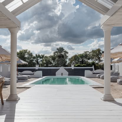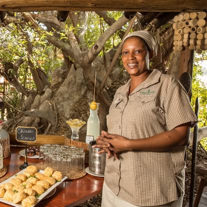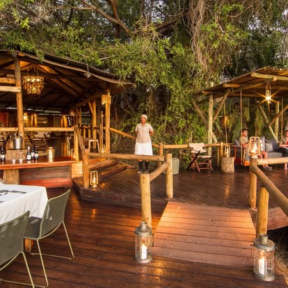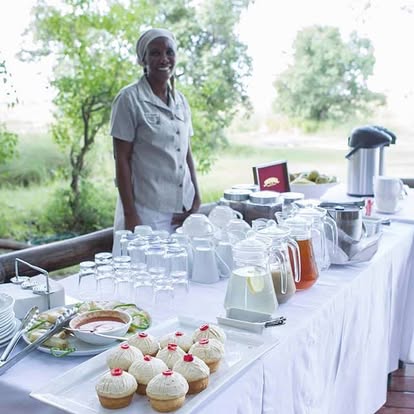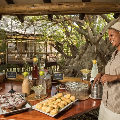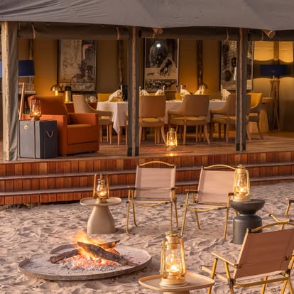 At the heart of the camp, the main lodge beckons with inviting lounges, a floodplain-facing swimming pool, and an outdoor fireplace where guests gather to trade safari stories under a blanket of stars. Dining is an experience in itself, with a live cooking station featuring a wood-fired pizza oven, turning meals into lively, communal affairs.
