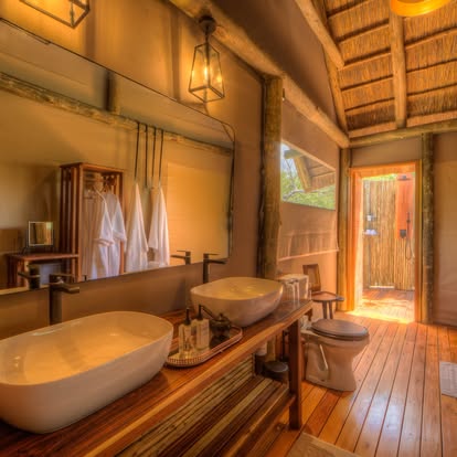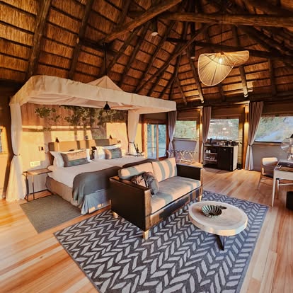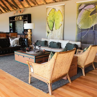 After days spent exploring, Kanana’s seven tented suites—including a spacious two-bedroom family unit—offer a haven of tranquility. Each airy retreat features a private deck, an en-suite bathroom with a generous walk-in shower framed by one-way glass for uninterrupted Delta views, and thoughtful touches like a coffee station and charging ports. The design, by Cate Simpson of Reflecting Africa, strikes a perfect balance between modern luxury and organic textures—think canvas, thatch, and handcrafted furnishings that echo the wilderness beyond.